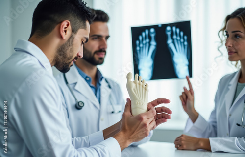Medical team discusses foot x-ray and anatomical model in hospital setting