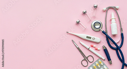 Medical tools and supplies arranged on a pink background for healthcare or pharmaceutical concepts and designs with copy space available