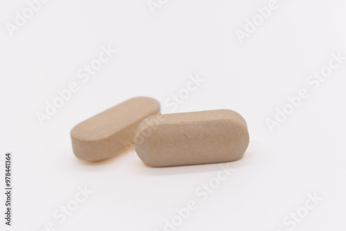 medicinal vitamin tablets isolated on white background, copy space, selective focus