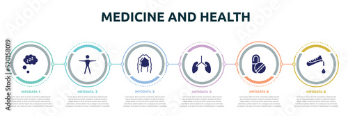 medicine and health concept infographic design template. included zzz sleep, human body standing, long wavy hair, lungs, capsule, test tube, flask and drop of blood icons and 6 option or steps.