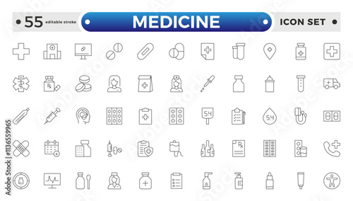 Medicine and Pharmaceutical icon set with prescription pad, medicine bottle, pill dispenser, lab test, blood donation, medical conference, and research study. Editable stroke outline icon.