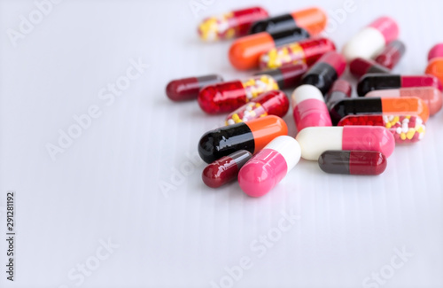 medicine concept; Assorted pharmaceutical medicine pills, tablets and capsules over white background.