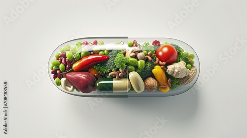 Medicine health concept. Nutritional supplement and vitamin supplements as a capsule with fruit vegetables nuts and beans inside a nutrient pill.