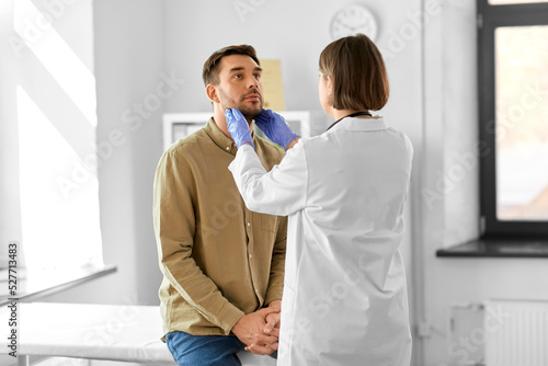 medicine, healthcare and people concept - female doctor checking lymph nodes of man patient at hospital