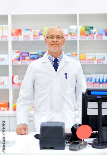 medicine, healthcare and people concept - senior apothecary at pharmacy cash register