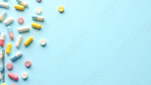 Medicine pills capsules tablets healthcare pharmaceutical on blue background