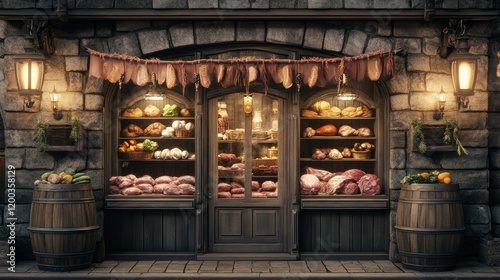 butcher, shop, meat, mediaeval, market, stone, building, night, lantern, food, store, ancient, rustic, old, vintage, dark, illuminated, display, window, product, barrel, vegetable, pork meat, beef, lamb, sausage, ham, bacon, produce, epicure, deli, historical, architecture, exterior, illumination, street, wooden, texture, hanging