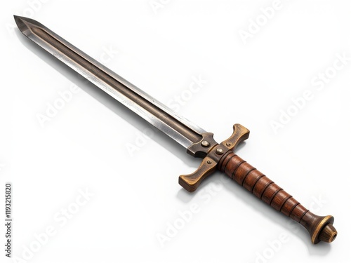 sword, mediaeval, fantasy, weapon, steel, blade, wooden, grip, handle, isolated, white, background, antique, ancient, historical, armoury, combat, battle, war, military, history, object, sharp, edge, game, rpg, design, illustration, rendering, armoring, pommel