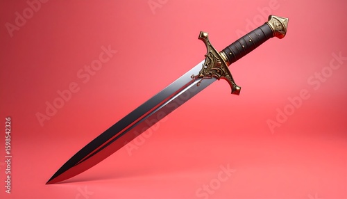 sword, mediaeval, blade, weapon, sharp, metal, gold, brown, leather, handle, armoring, fantasy, historical, illustration, three-dimensional, render, red, crimson, background, light, shadow, detail, design, vintage, ancient, object, still, life, sharpness, polished, pointed, decoration, ornamental, art, graphic, digital, imagery, weaponry, military, history, artifact