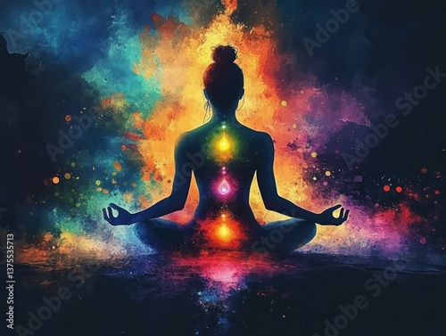 Meditation and Chakras Silhouette with Glowing Energy in Abstract Watercolor Style