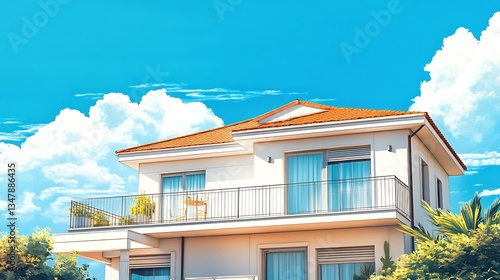 house, home, building, architecture, residence, villa, property, estate, dwelling, balcony, terrace, window, door, roof, sky, cloud, sun, summer, day, blue, white, orange, plant, greenery, tree, mediterranean, coastal, sunny, bright, calm, serene, peaceful, relaxing, tranquil, idylli, dream, honed, luxury, beautiful