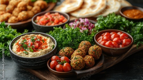 Mediterranean mezze set with hummus, falafel, and pita bread