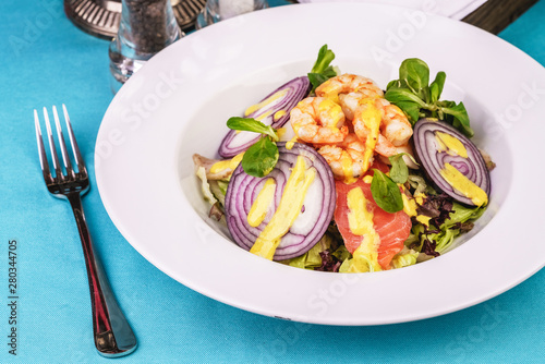 Mediterranean salad. grilled prawns, red onion rings, lemon peel, ginger root and vegetables dressed with olive oil