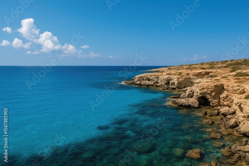 water, sky, summer, travel, background, landscape, sea, beauty, blue, europa, rock, island, mediterranean, coastline, coast, shore, bay, beach, petra, crescent, aphrodite, horizontal, western, scene, clear, cyprus, destination, nobody, scenic, seascape, tranquil, vacation