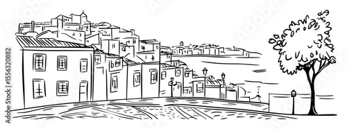 street, building, mediterranean, coast, architecture, town, urban, sea, tree, vector, hand-drawn, outline, scenery