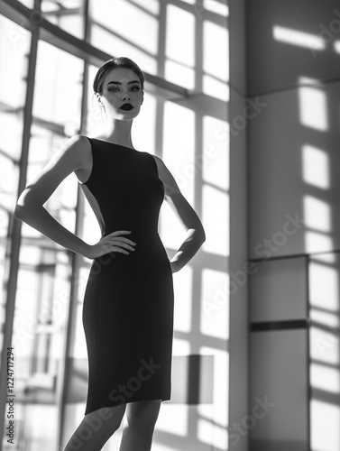 Medium shot of a confident young woman in a sleek black dress, standing in a modern interior with dramatic shadow patterns. Minimalist and bold elegance.