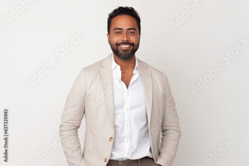 indian, pakistani, medium, portrait, glad, happy, blissful, joyful, content, radiant, delighted, smiling, rejoicing, adult, father, professional, 30s, eltern, male, outerwear, elegant, cardigan, trendy, knitwear, stylish, casual attire, buttons, fashion, sweater, white background, empty, clean, neutral, minimal, isolated, simple, clear, plain, blank