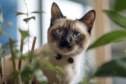 Medium shot portrait photography of a curious siamese cat scratching against an indoor plant. With generative AI technology
