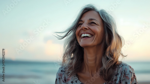 medium, shot, portrait, photo, grinning, mature, woman, laughing, serene, beach, background, generative, ai, technology, illustration