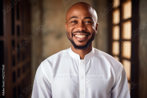 Medium shot portrait photography of a happy Nigerian man in his 30s wearing a simple tunic against an abstract background