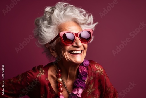 Medium shot portrait photography of a happy old woman wearing a daring bikini and trendy sunglasses against a burgundy red background. With generative AI technology