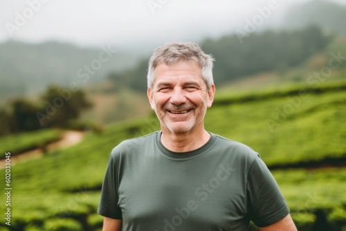 Medium shot portrait photography of a satisfied man in his 50s wearing a casual t-shirt against a tea plantation or farm background. Generative AI