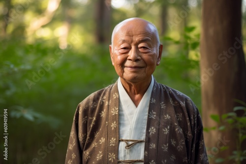 Medium shot portrait photography of a satisfied man in his 80s that is wearing a chic cardigan against a bamboo forest background . Generative AI