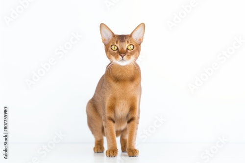 Medium shot portrait photography of a smiling abyssinian cat hunting in front of minimalist or empty room background