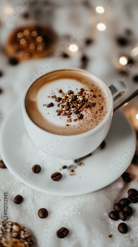 Melange coffee sits elegantly in a white cup, topped with frothy milk and sprinkled with golden accents, inviting warmth and comfort in a cozy ambiance.
