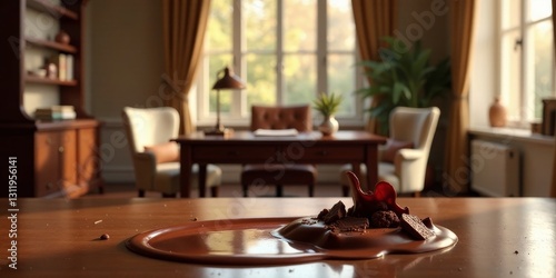 Melted Chocolate Indulgence on a Polished Wooden Table in a Sunlit Room with Elegant Furnishings