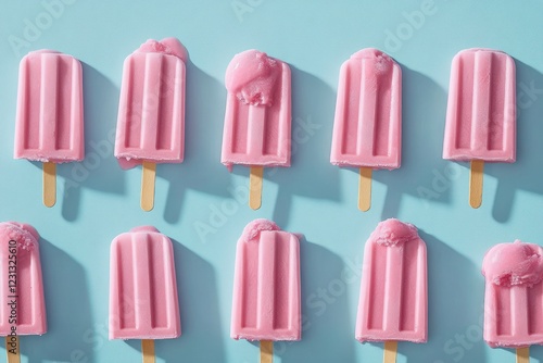 Melting Pink Ice Cream Popsicles on Soft Blue Background Creative Summer Pattern