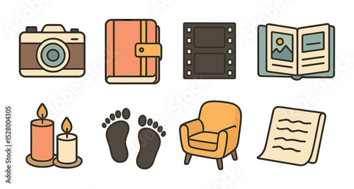 memory, moment, vintage, camera, diary, film, disrobed, picture, set, vector, album, candle, footprint, cosy, isometric, flat, chair, handwritten, note