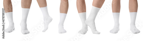 Men in stylish socks on white background, collection of photos