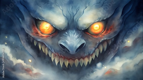 menacing, creature, glowing, eye, sharp, teeth, dark, sky, horror, scarey, halloween, monster, skittish, eerie, nightmare, fantasy, evil, terrifying, illustration, supernatural, fear, monstrous, creepy, shadowy, darkness, surreal, chilling, haunted