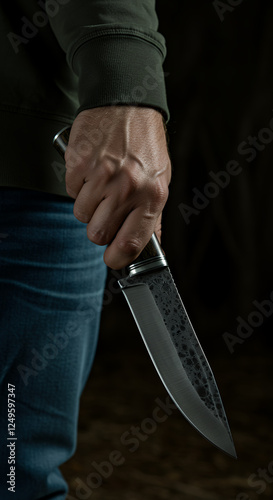 Menacing Grip: Hand Holding Forged Knife in Dark, Dramatic Lighting - Sharp Blade, Danger, and Mystery
