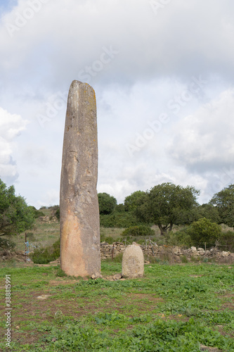 Menhir megalith stone in Sardinia Sardegna Italy big megalith stone standing in field archeological monument history, Villa Sant'Antonio, Sardinia