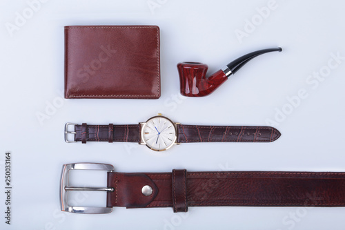 Men's accessories for business and rekreation. Leather belt, wallet, watch and smoking pipe on white background.. Top view composition.