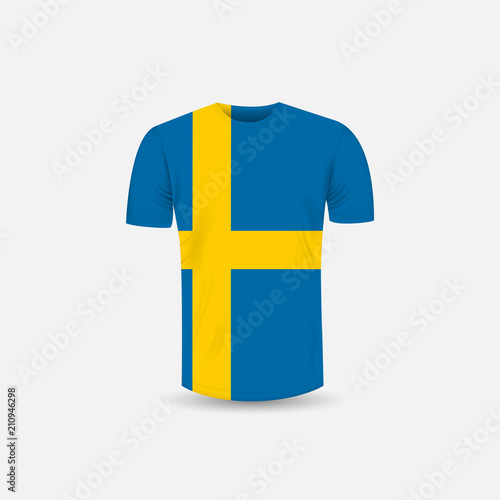 Men's T-shirt icon and Sweden flag background.Round neck Jersey background.Front view.Shadows and highlights mock-up templates.White jersey mock up template design.Vector Illustration