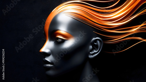 Mental health and creative abstract concept. Orange and gold illustration of happy woman's head in abstract style. Mindfulness and self care idea.