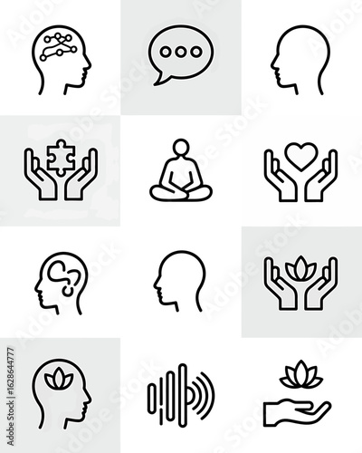 Mental Health and Wellbeing Icons Emotional Support, Mindfulness, and Cognitive Function in Symbolic Line Art