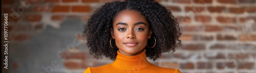 Mental Health and Wellness Concept, A woman with curly hair in a vibrant orange top poses confidently against a rustic brick backdrop.