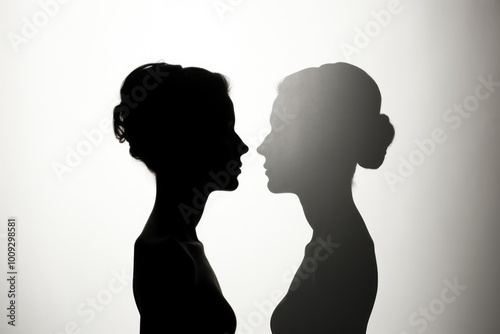 black-and-white, hi-res, mental health, backlighting, downloadable, togetherness, studio shot, young adult, copy space, human face, human head, monochrome, silhouette, two people, half face, closeup, head shot, portrait, bonding, kissing, double, female, health, mental, person, shadow, adult, black, human, image, photo, woman, face, head, love, nose, bw, hd