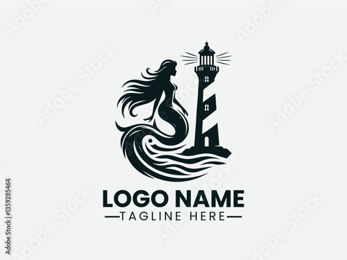 Mermaid with Lighthouse Nautical Fantasy Logo Design, Nautical Mermaid Lighthouse Logo