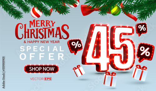 Merry Christmas, 45 percent Off discount. Sale banner and poster. Vector illustration.