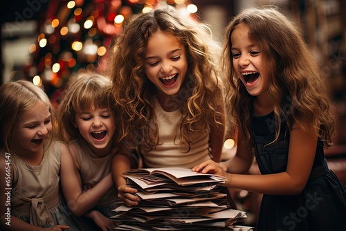 Merry Christmas and Happy Holiday! Cute little children girls with present gift box near tree at home.