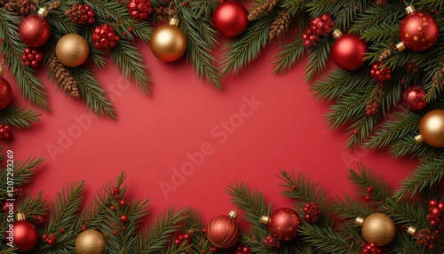 christmas, ornament, red, background, evergreen, festive, holiday, winter, decoration, season, christmas, gold, pine, branch, berry, design, template, greeting, card, celebration, joy, gift, happy, new, year, december, tree, cone, ball, image, banner, poster, marketing, advertising, sale, promotion, concept, merry, elegant, luxury