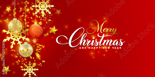 Merry Christmas and Happy New Year realistic background design with Christmas tree, ball snow, and bokeh sparkle effect. Merry Christmas holiday design. Realistic Christmas invite card design.