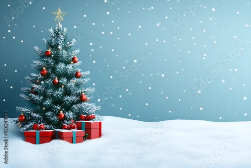 Merry Christmas and realistic background with 3d Christmas tree and gifts, layout with copy space