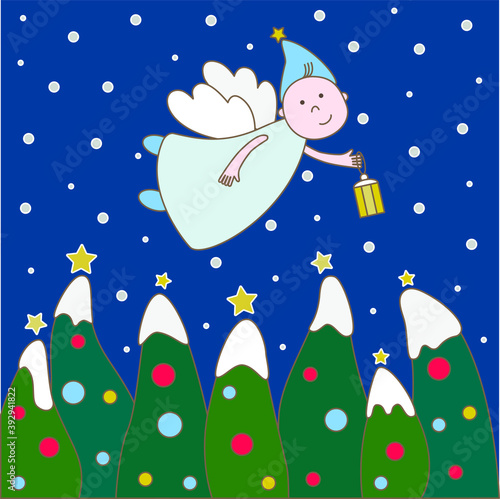 christmas, angel, celebration, winter, tree, snow, snowman, illustration, holiday, card, blue, cartoon, art, snowflake, santa, season, cold, decoration, happy, greeting, star, gift, design, white, sky