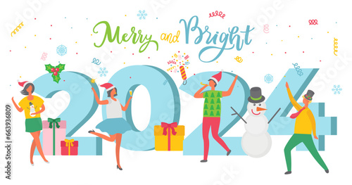 Merry Christmas card. Vector illustration. New Year party invitation was filled with Christmas decorations and themes Lettering on holiday poster gleamed in festive A postcard 2024 Merry and Bright